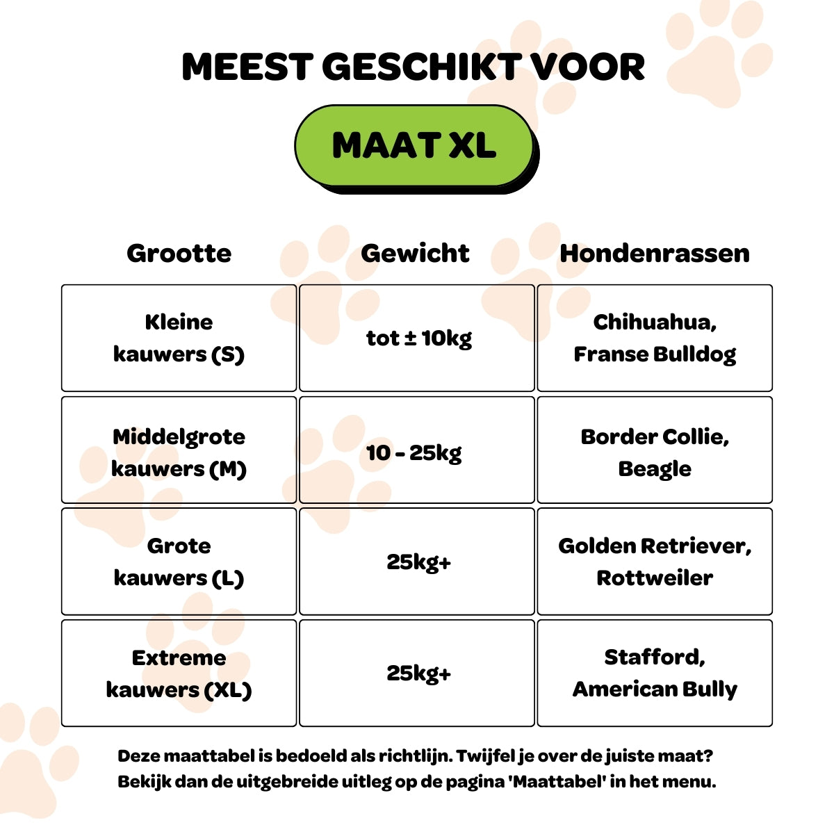 Wij hebben het wiel opnieuw uitgevonden! 😜 Dit is Walter het Wiel XL: dankzij het oersterke materiaal en de tandreinigende groeven is Walter perfect voor honden met échte kauwpower én helpt hij spelenderwijs het gebit gezond te houden. Deze extra grote variant is speciaal ontworpen voor grote honden (XL), zodat ook de krachtigste kauwers veilig en uitdagend kunnen spelen.