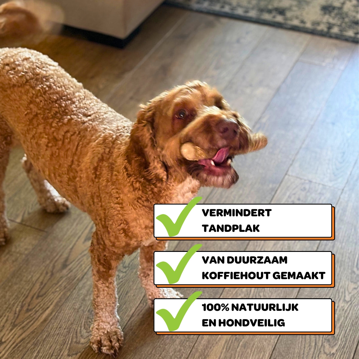 ⚠️Er kunnen stukjes loskomen van de kauwstok, dit is compleet veilig. Het is gemaakt van 100% natuurlijk koffiehout en breekt af in kleine, zachte vezels. Heb je een sterke kauwer? Pak dan altijd een maatje groter.