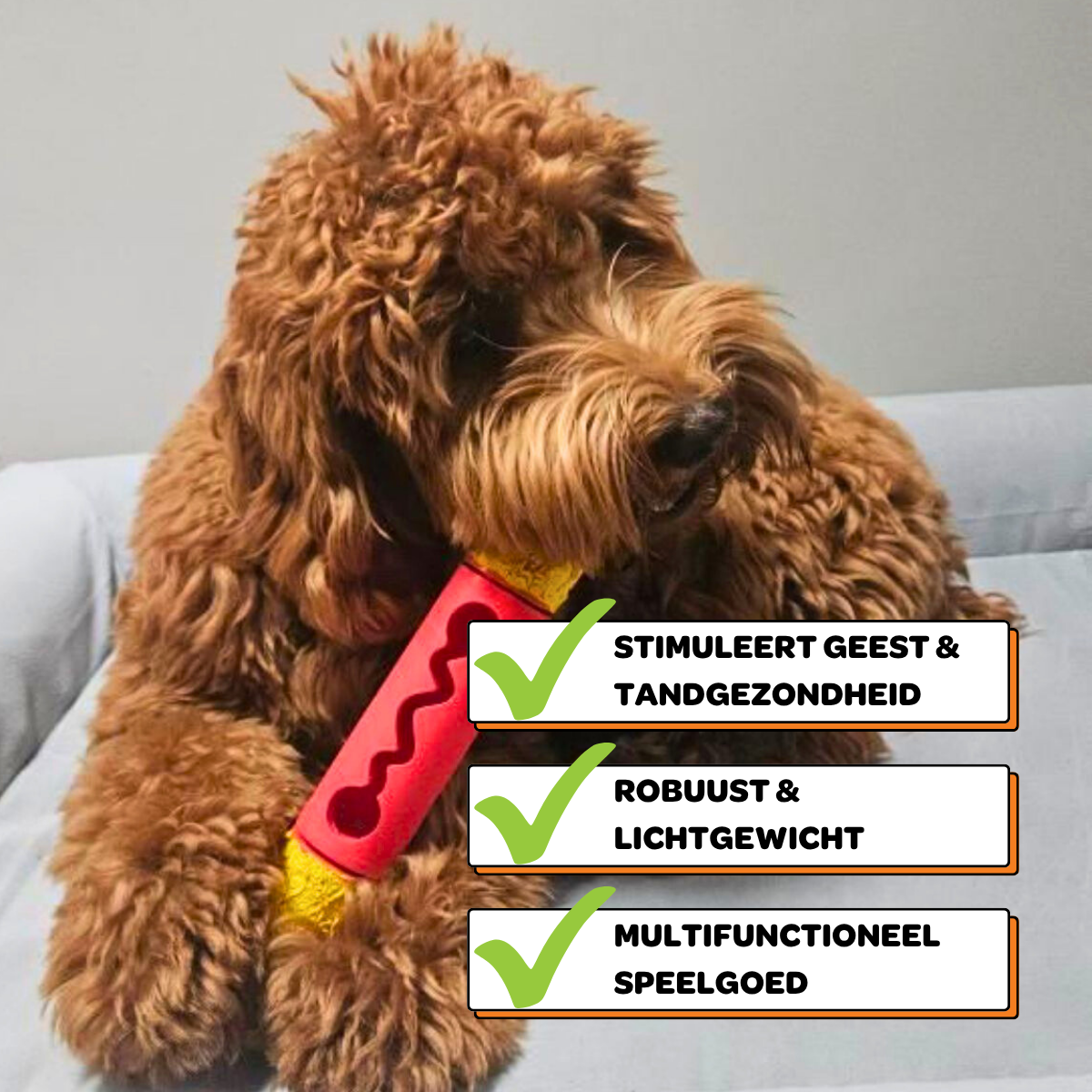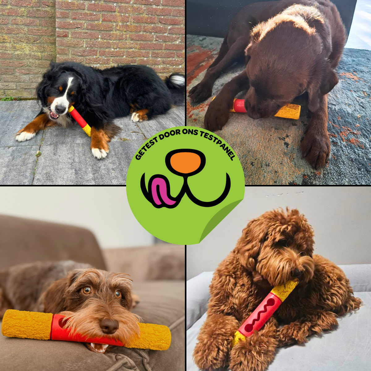 Apporteren wordt pas écht een feestje met Stokkie de Stuntman: een vrolijk stuk hondenspeelgoed dat tegen een stootje kan. Lichtgewicht en super sterk, dus perfect grote honden met kauwpower. 😋